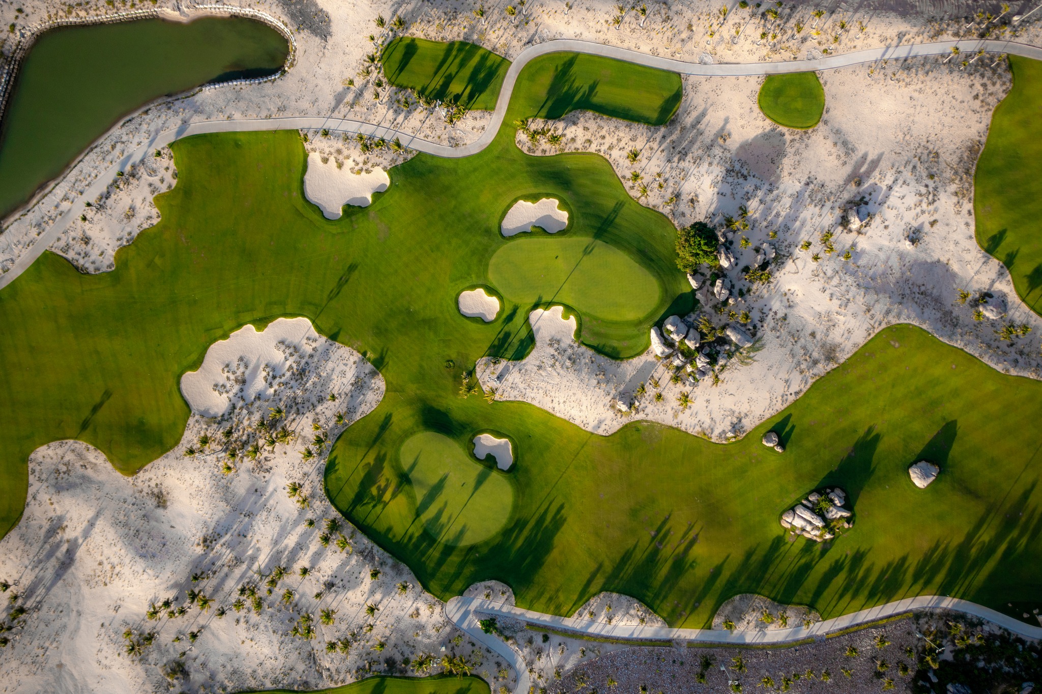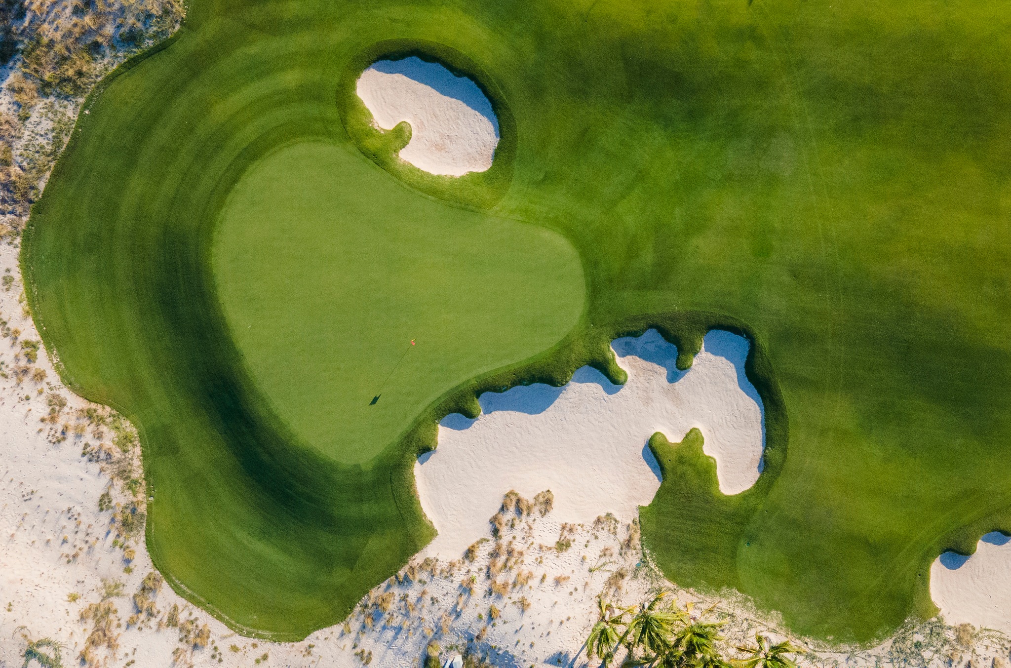 Địa hình: **Sân golf bờ biển (Links)**, kết hợp giữa cát trắng, rặng dừa và núi đá tự nhiên, tầm nhìn hướng ra Biển Đông.