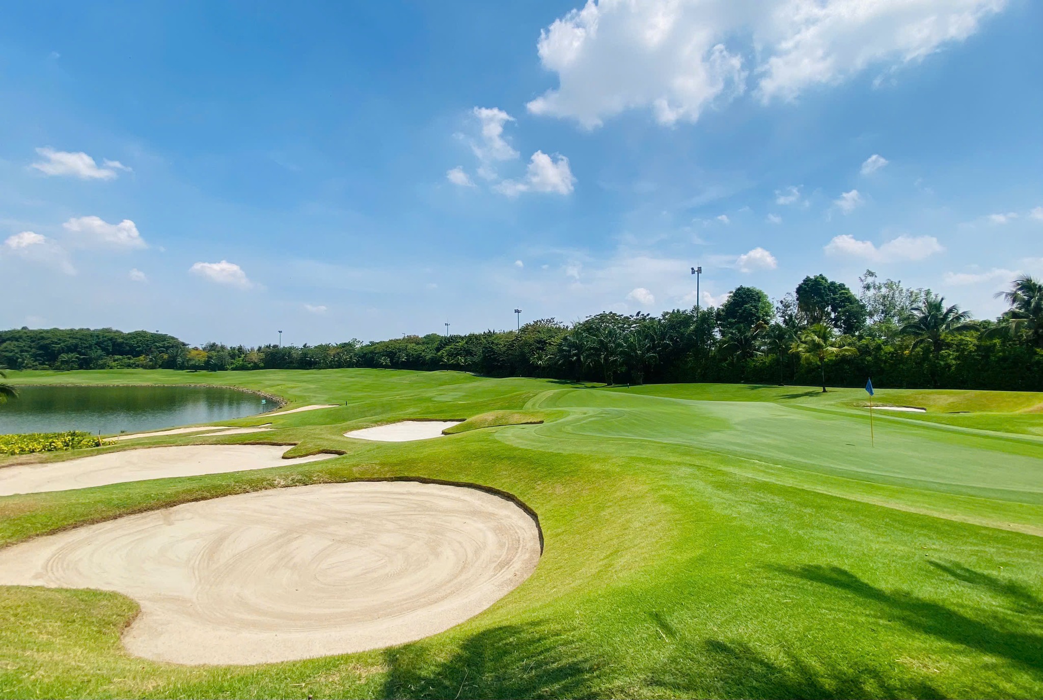 **Đặc điểm:Địa hình lượn sóng tự nhiên, kết hợp khéo léo giữa hồ nước, bẫy cát và thảm cỏ chất lượng cao (Paspalum Platinum & TifEagle).